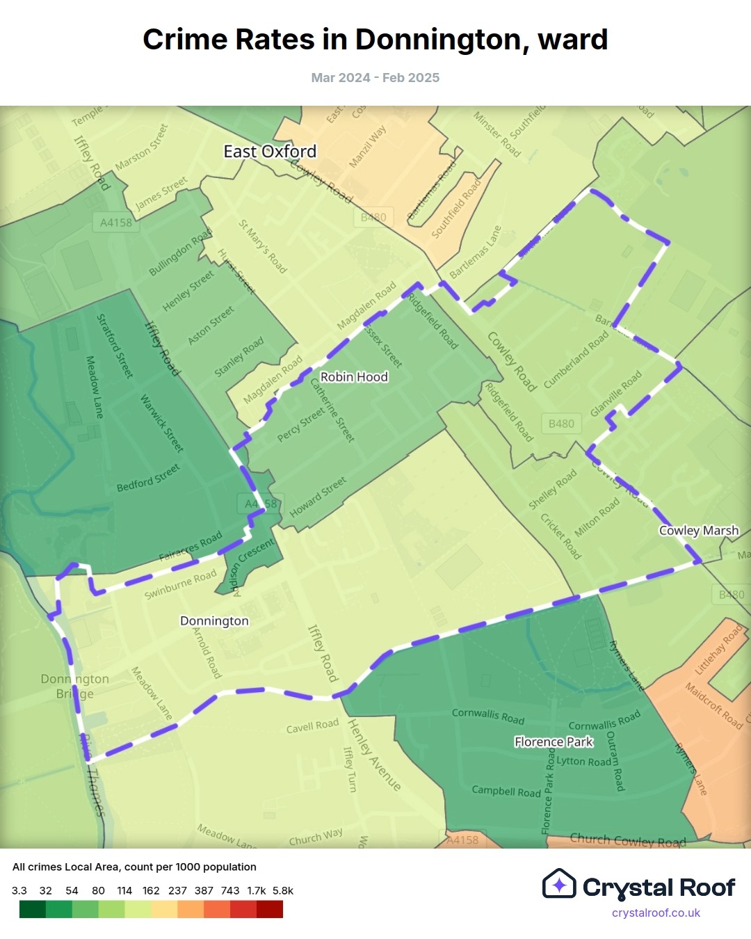Donnington (ward) is located within Oxford (borough). Annual total crime rate in Oxford (borough) is 112 crimes per thousand resident population, which can be rated as 5 out of 10 or medium crime level compared to other local authority districts in England and Wales.