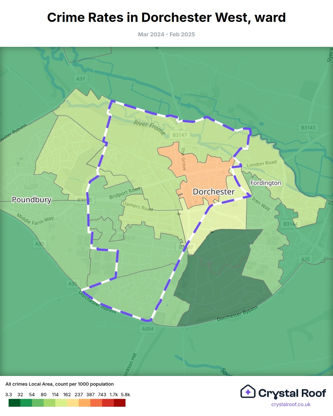 The figures in grey indicate the relative ratings of Dorchester West (ward) for a specific crime type compared to other wards in England and Wales.