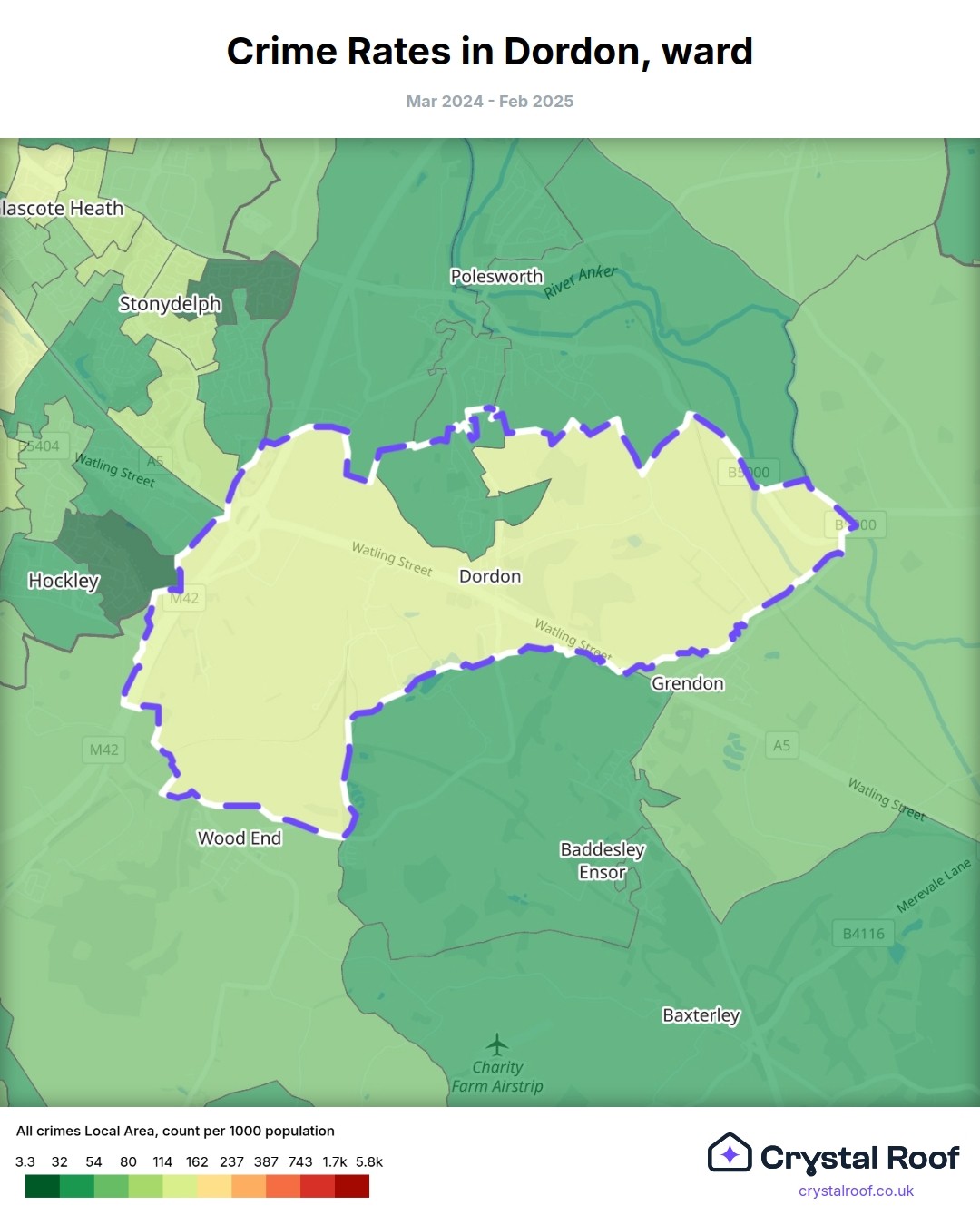 The figures in grey indicate the relative ratings of Dordon (ward) for a specific crime type compared to other wards in England and Wales.