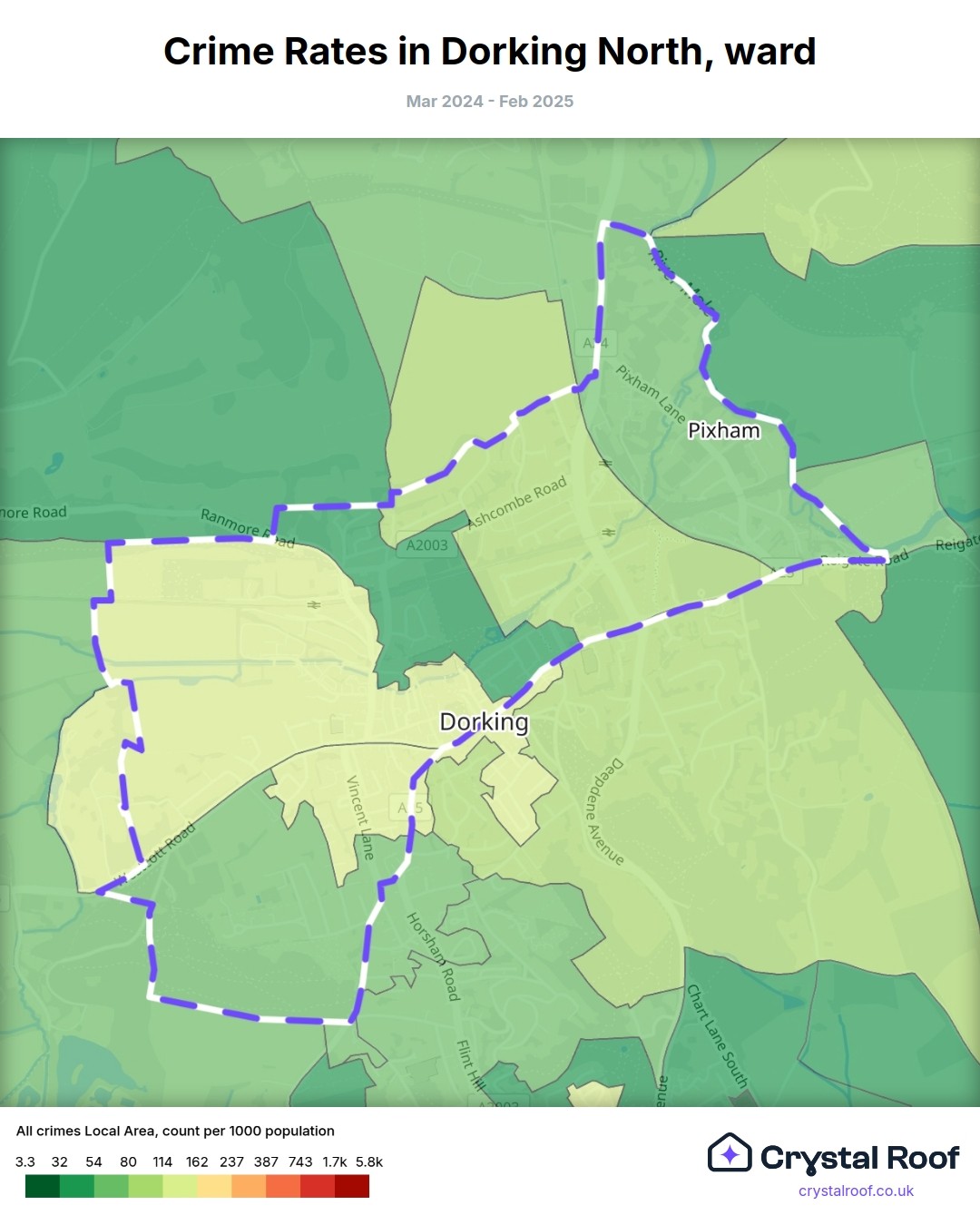Dorking North, (ward) includes areas with the following crime ratings (see map):