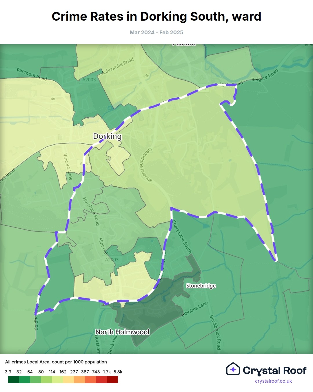Dorking South, (ward) includes areas with the following crime ratings (see map):