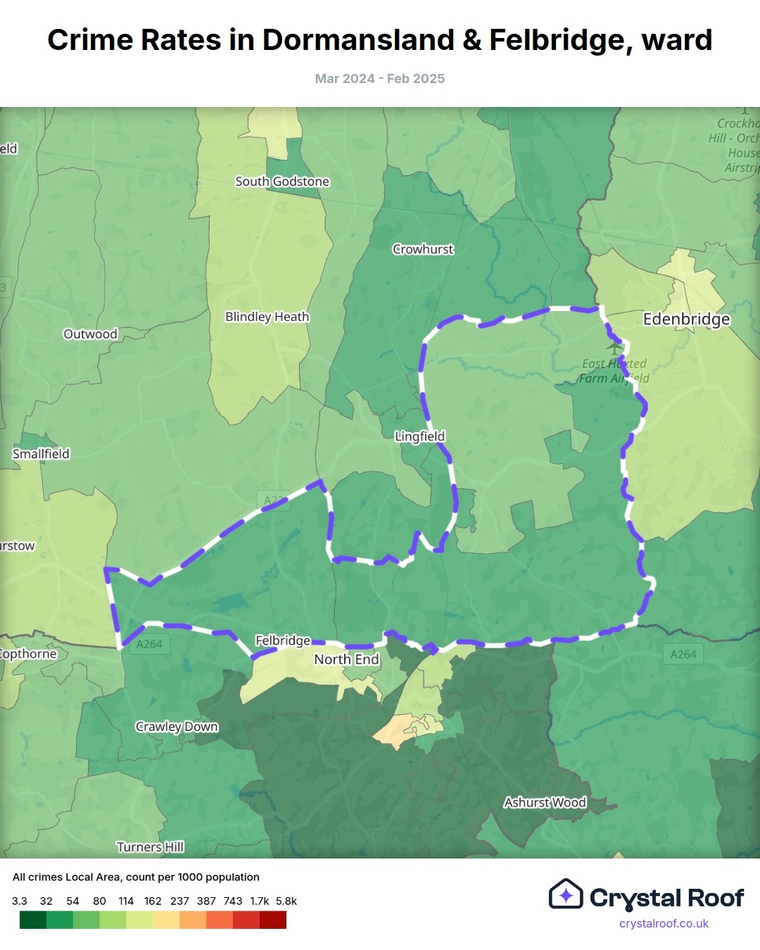 Dormansland & Felbridge, (ward) includes areas with the following crime ratings (see map):