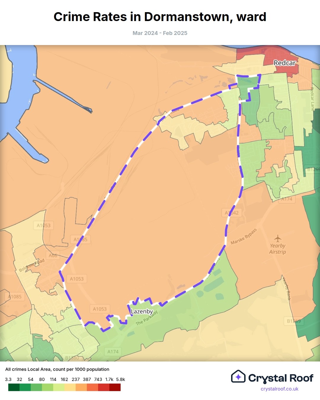Dormanstown, (ward) includes areas with the following crime ratings (see map):