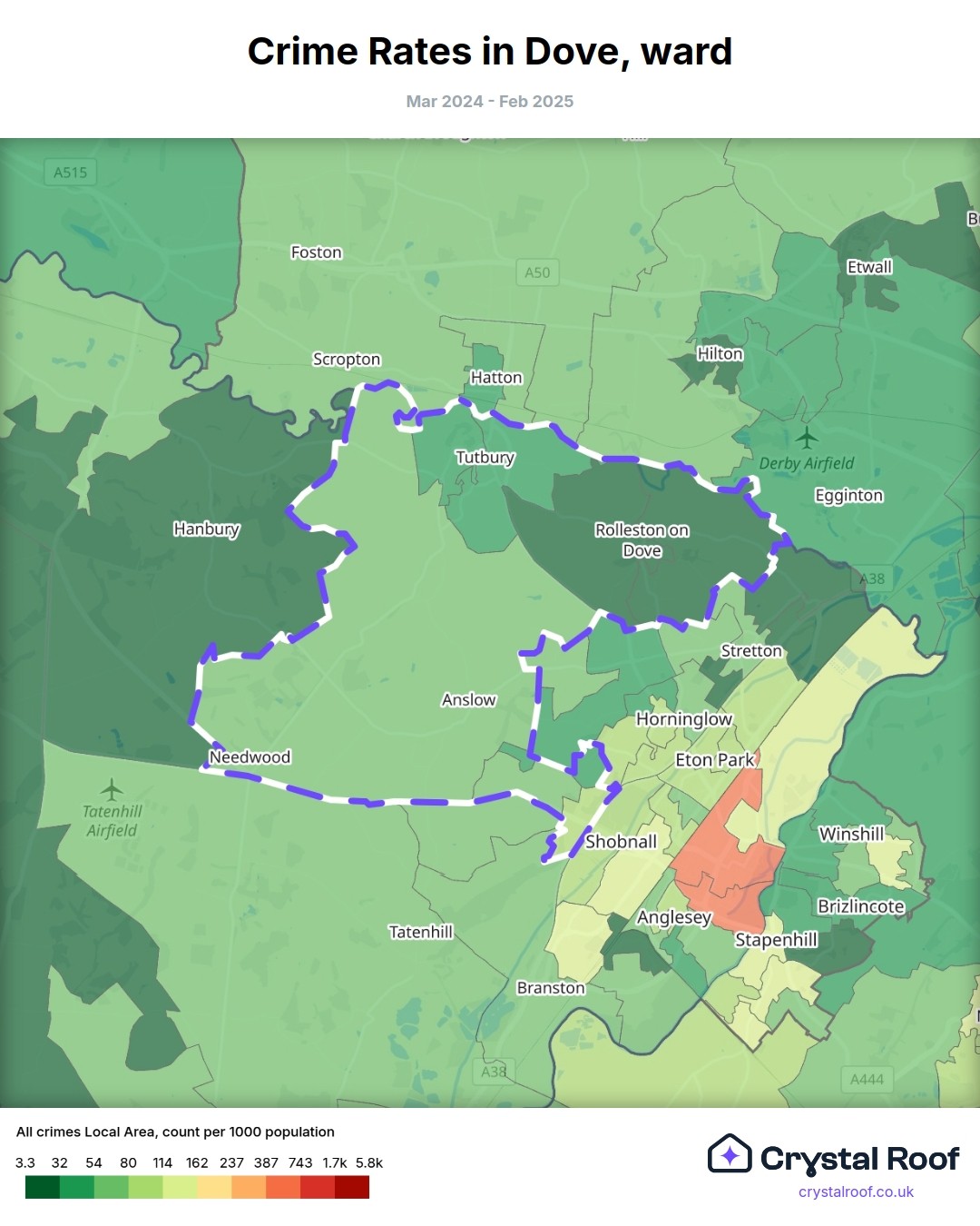 Dove (ward) is located within East Staffordshire (borough). Annual total crime rate in East Staffordshire (borough) is 77.6 crimes per thousand resident population, which can be rated as 3 out of 10 or low crime level compared to other local authority districts in England and Wales.