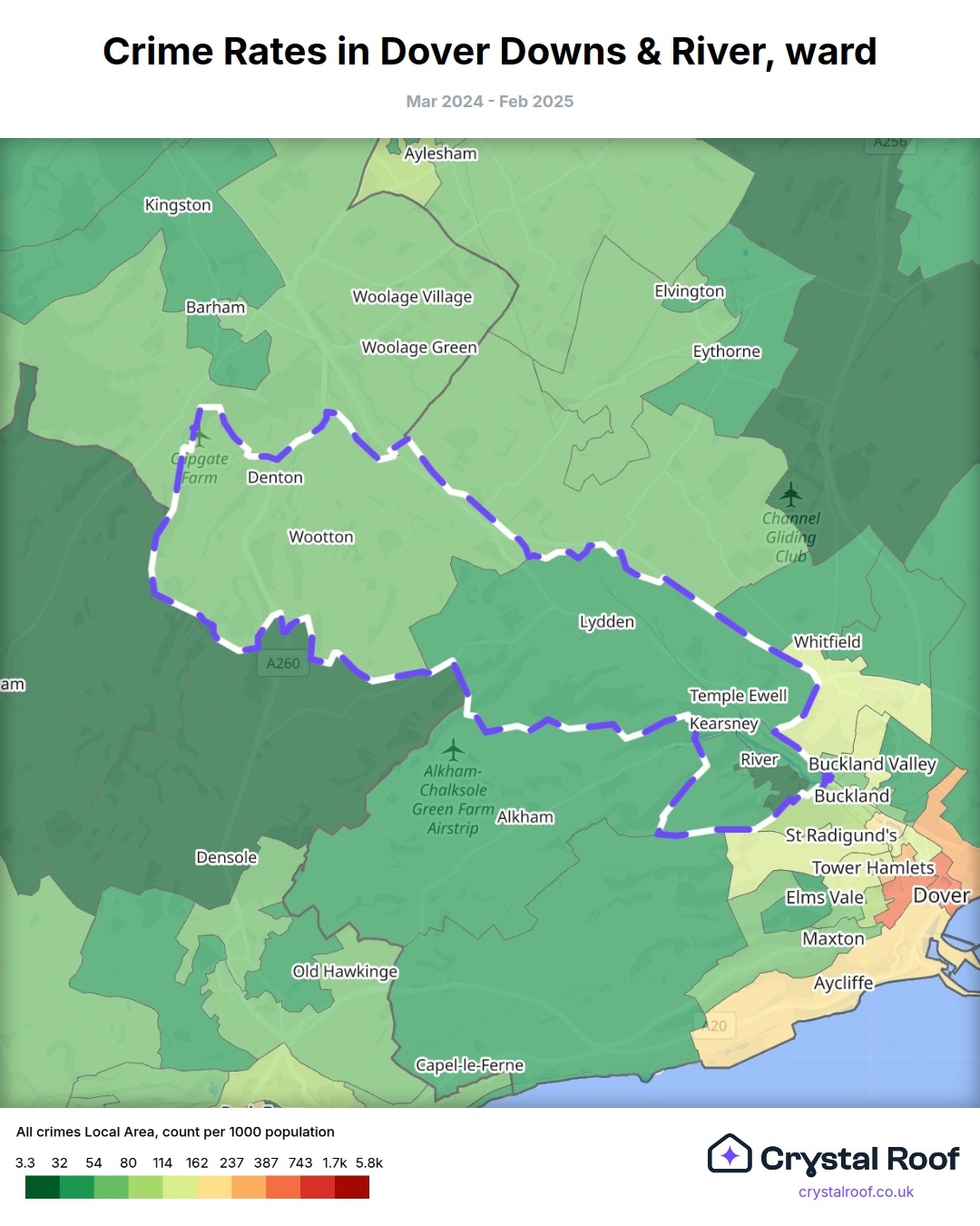 The figures in grey indicate the relative ratings of Dover Downs & River (ward) for a specific crime type compared to other wards in England and Wales.