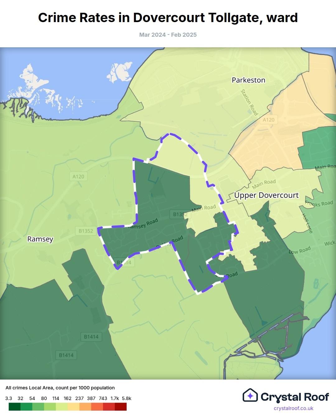 Dovercourt Tollgate, (ward) includes areas with the following crime ratings (see map):