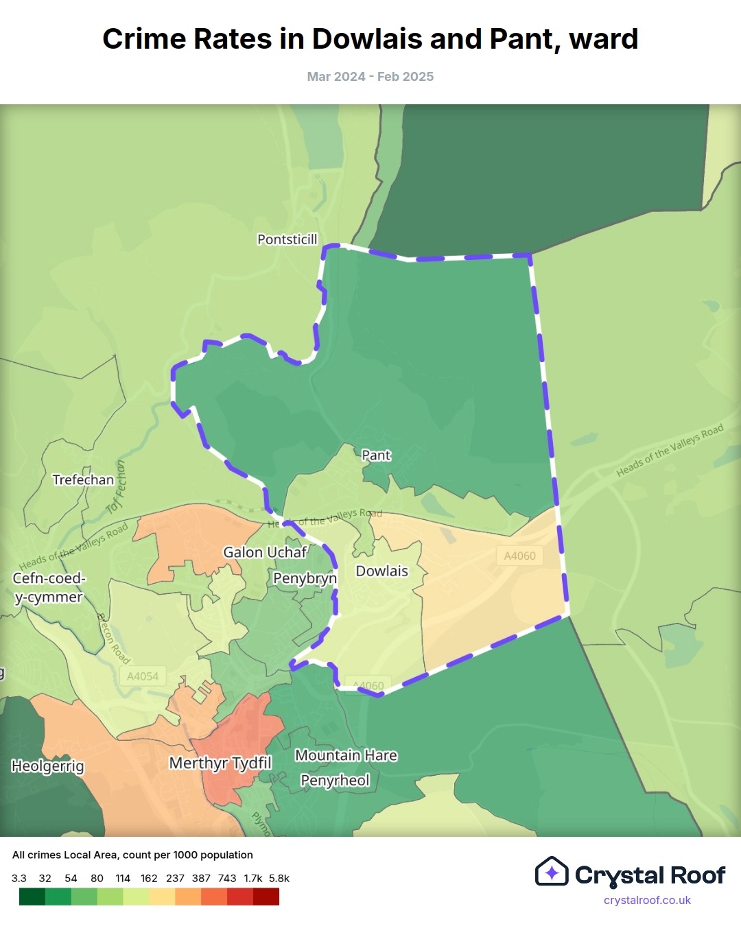 Dowlais and Pant, (ward) includes areas with the following crime ratings (see map):