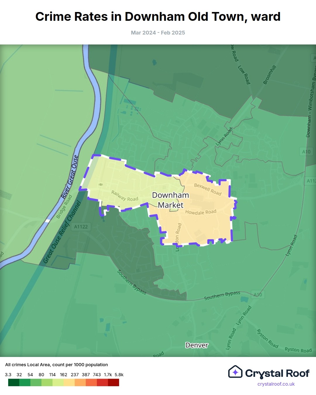 The figures in grey indicate the relative ratings of Downham Old Town (ward) for a specific crime type compared to other wards in England and Wales.