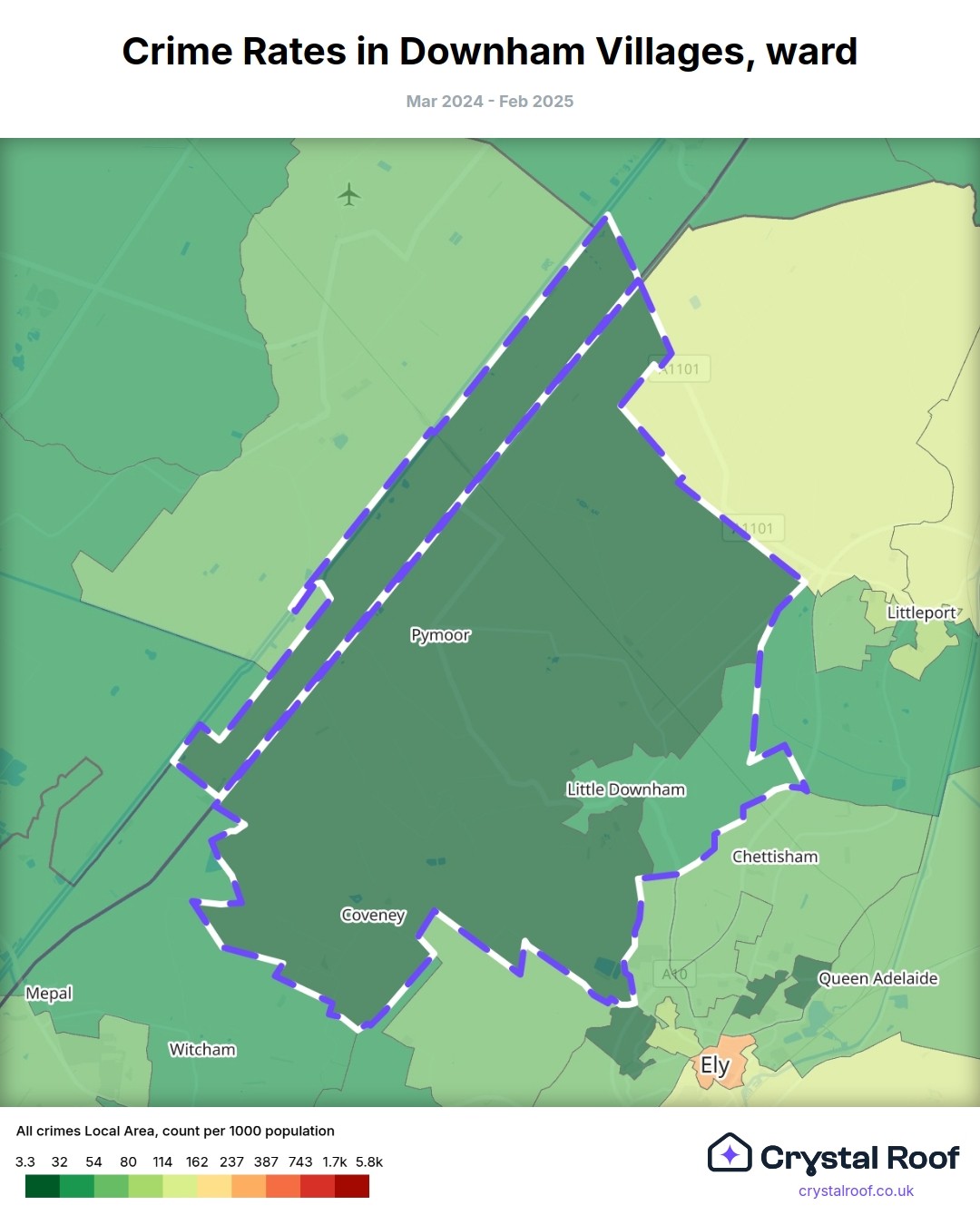Downham Villages (ward) is located within East Cambridgeshire (borough). Annual total crime rate in East Cambridgeshire (borough) is 58.5 crimes per thousand resident population, which can be rated as 2 out of 10 or low crime level compared to other local authority districts in England and Wales.