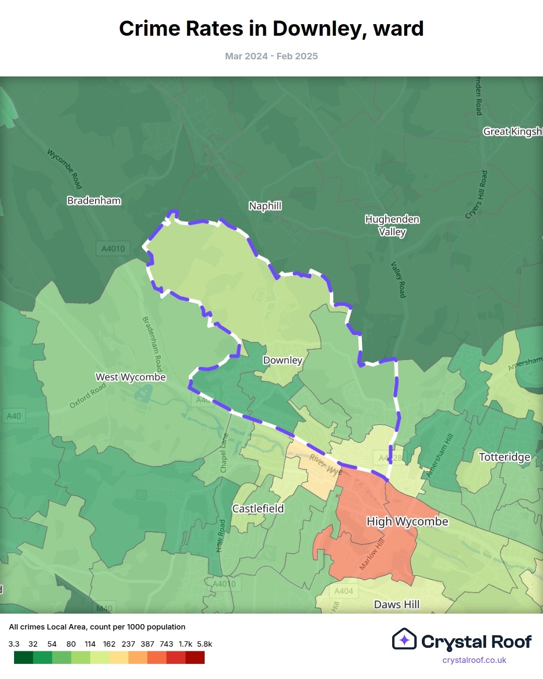 Downley, (ward) includes areas with the following crime ratings (see map):