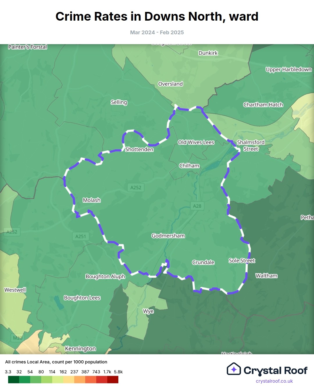 Downs North (ward) is located within Ashford (borough). Annual total crime rate in Ashford (borough) is 82.7 crimes per thousand resident population, which can be rated as 3 out of 10 or low crime level compared to other local authority districts in England and Wales.