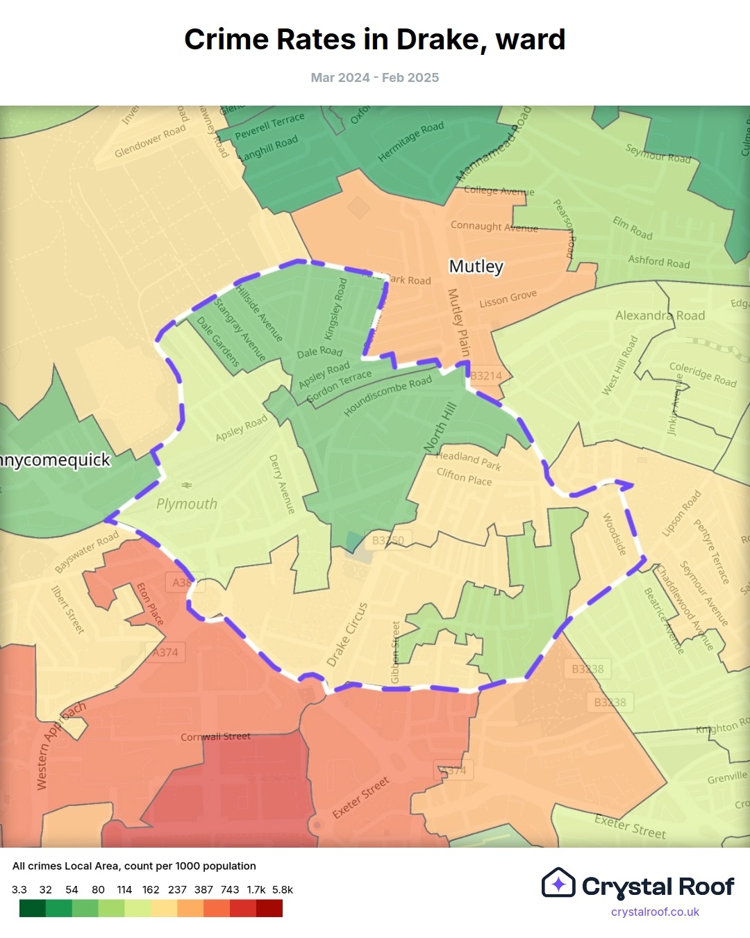 Drake (ward) is located within Plymouth (borough). Annual total crime rate in Plymouth (borough) is 114 crimes per thousand resident population, which can be rated as 5 out of 10 or medium crime level compared to other local authority districts in England and Wales.