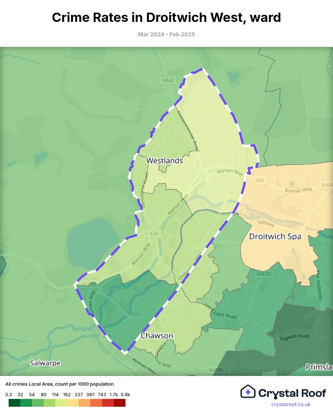 Droitwich West, (ward) includes areas with the following crime ratings (see map):