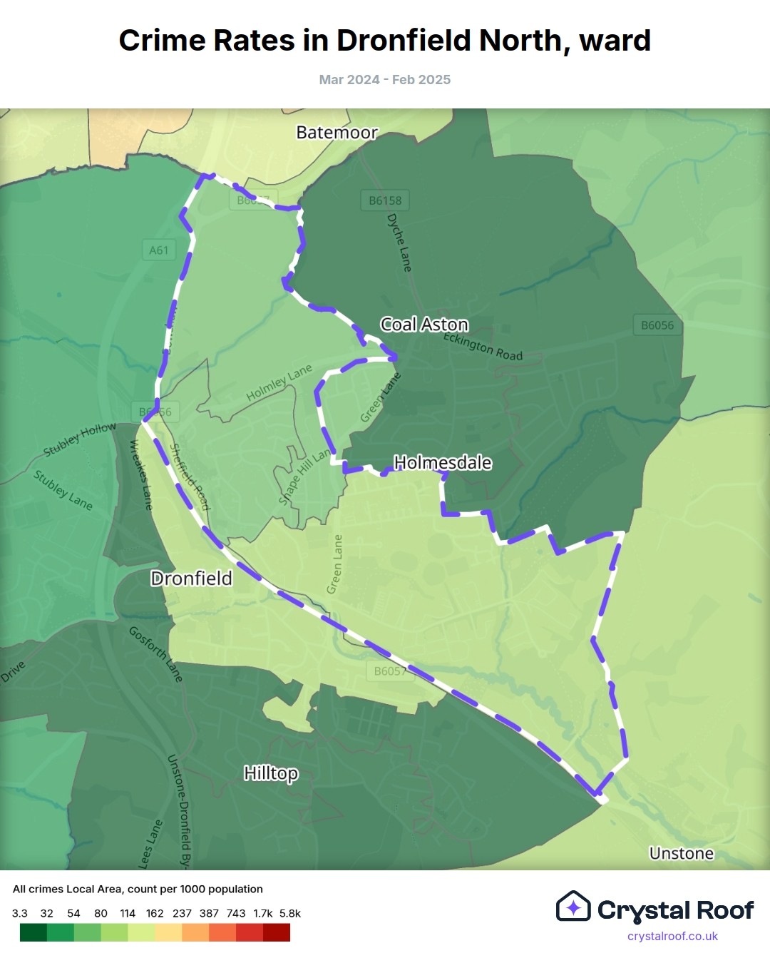 Dronfield North, (ward) includes areas with the following crime ratings (see map):