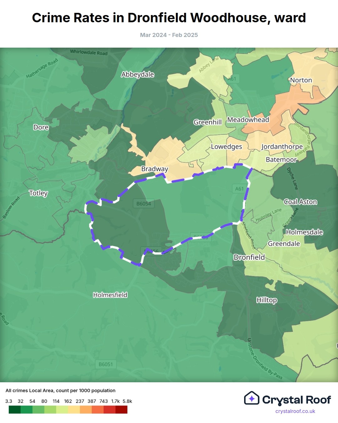 Dronfield Woodhouse, (ward) includes areas with the following crime ratings (see map):