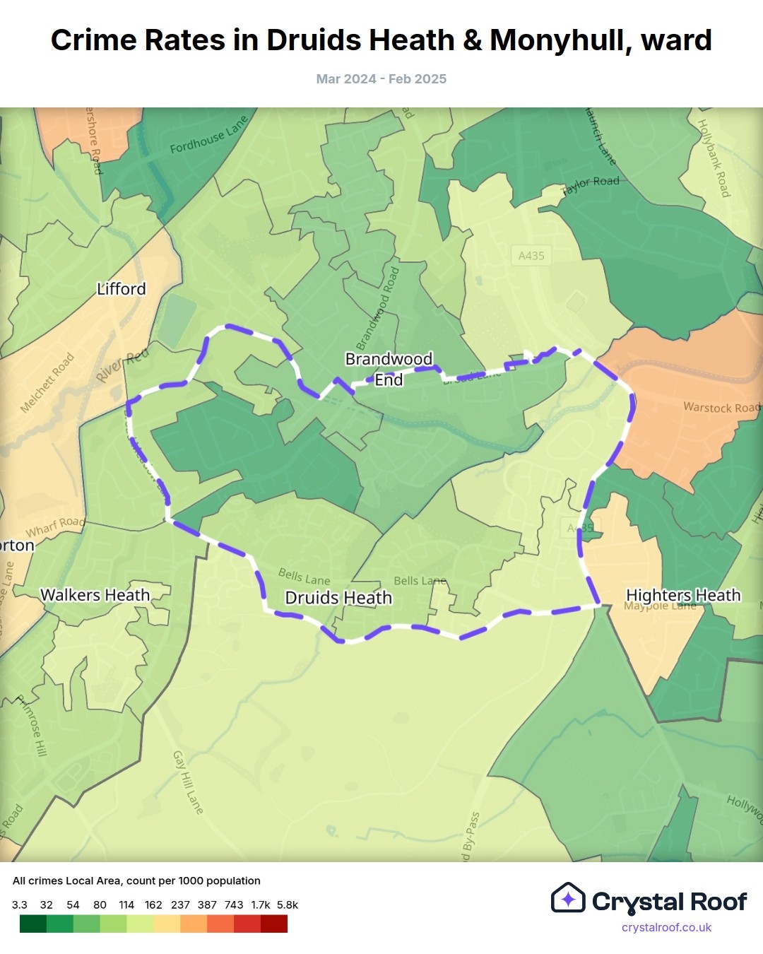 Druids Heath & Monyhull, (ward) includes areas with the following crime ratings (see map):