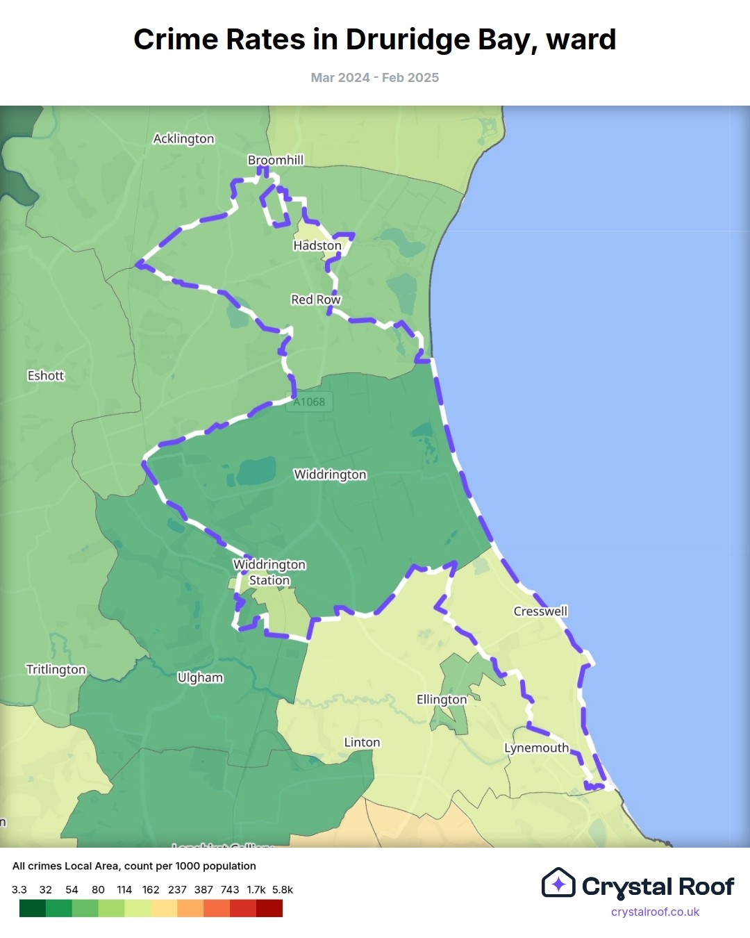 Druridge Bay, (ward) includes areas with the following crime ratings (see map):