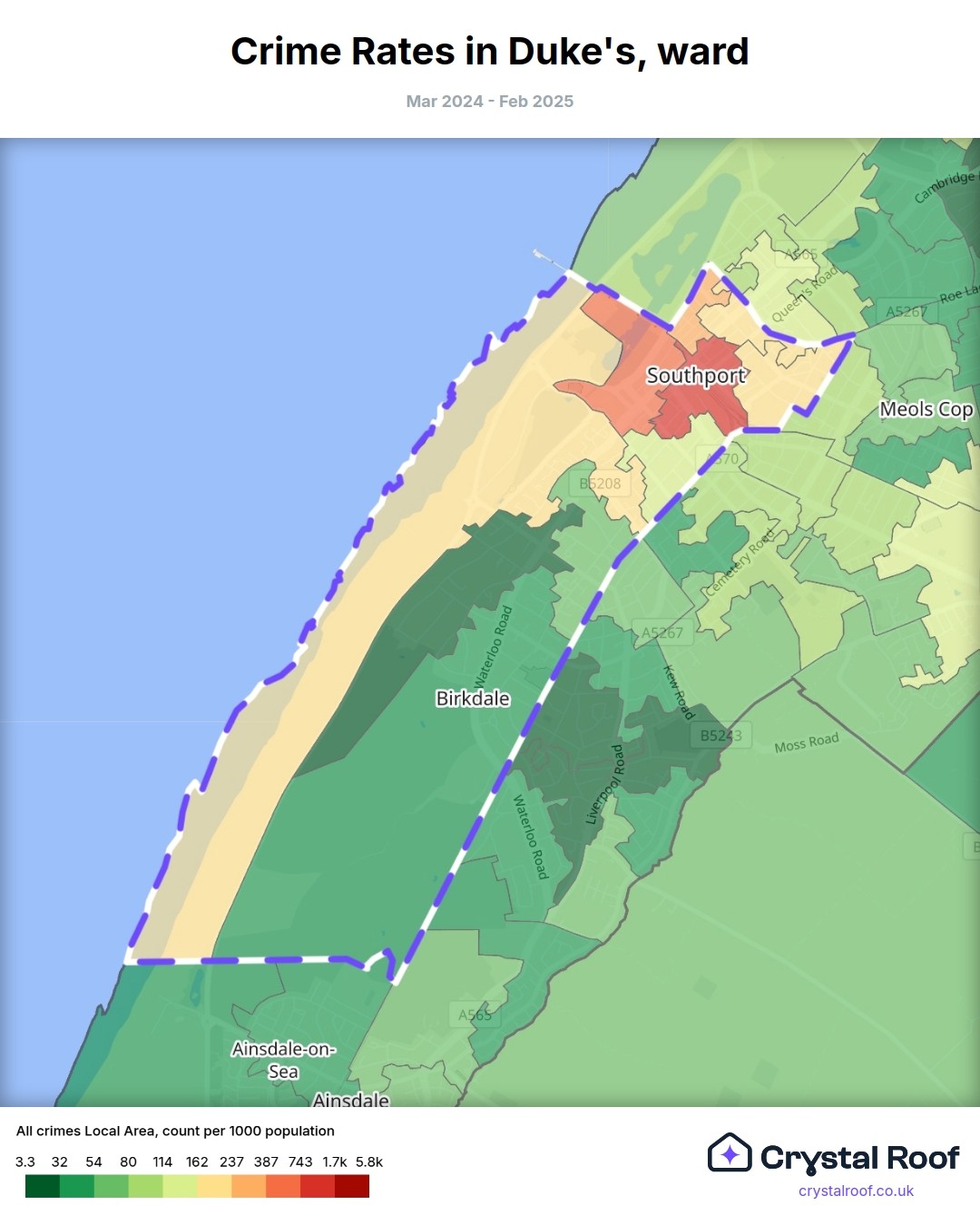Duke's (ward) is located within Sefton (borough). Annual total crime rate in Sefton (borough) is 86.3 crimes per thousand resident population, which can be rated as 4 out of 10 or low crime level compared to other local authority districts in England and Wales.