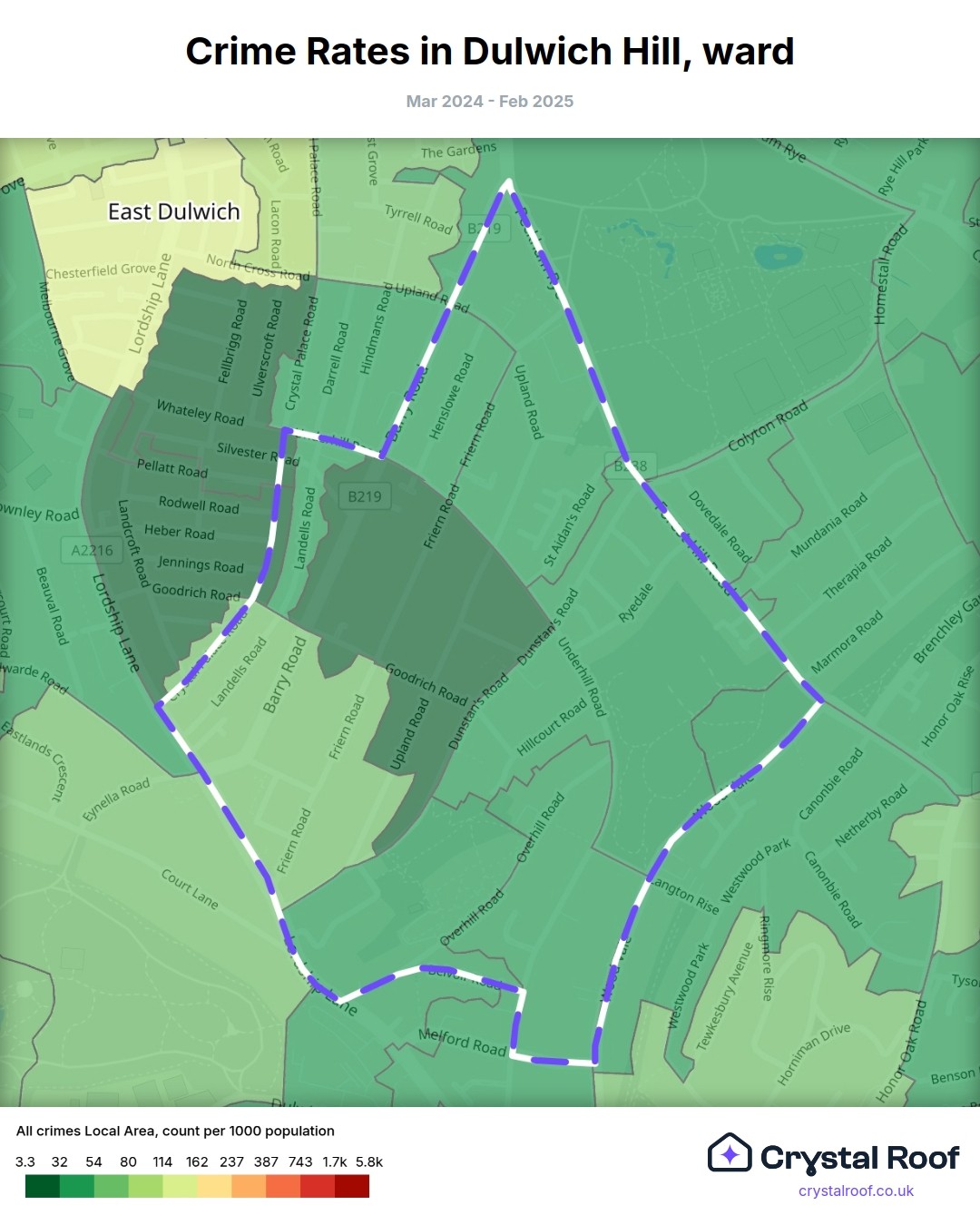 Dulwich Hill (ward) is located within Southwark (borough). Annual total crime rate in Southwark (borough) is 161 crimes per thousand resident population, which can be rated as 7 out of 10 or high crime level compared to other local authority districts in England and Wales.
