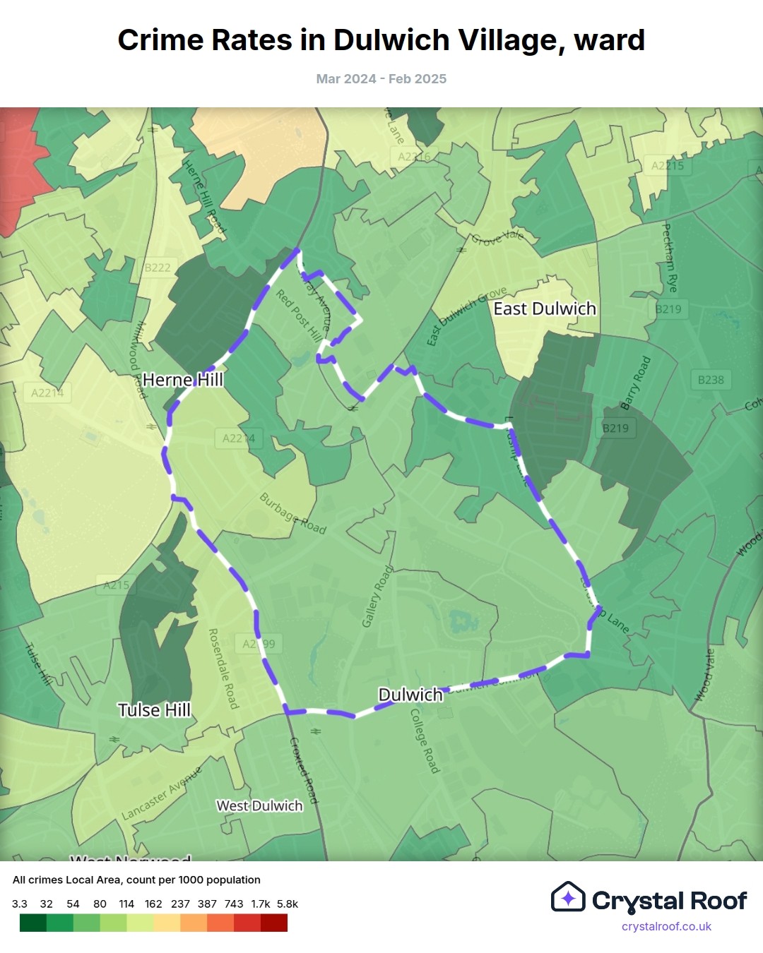 Dulwich Village, (ward) includes areas with the following crime ratings (see map):