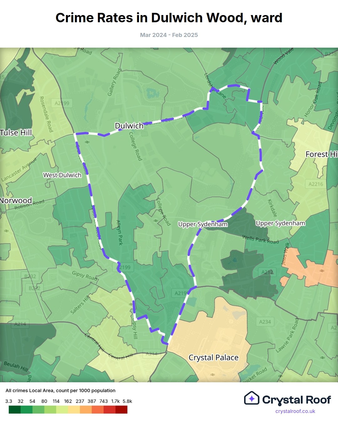 Dulwich Wood, (ward) includes areas with the following crime ratings (see map):