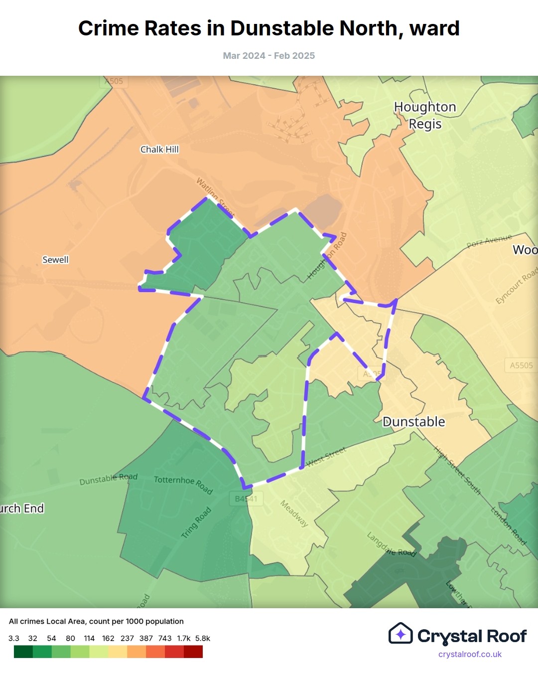 Dunstable North, (ward) includes areas with the following crime ratings (see map):