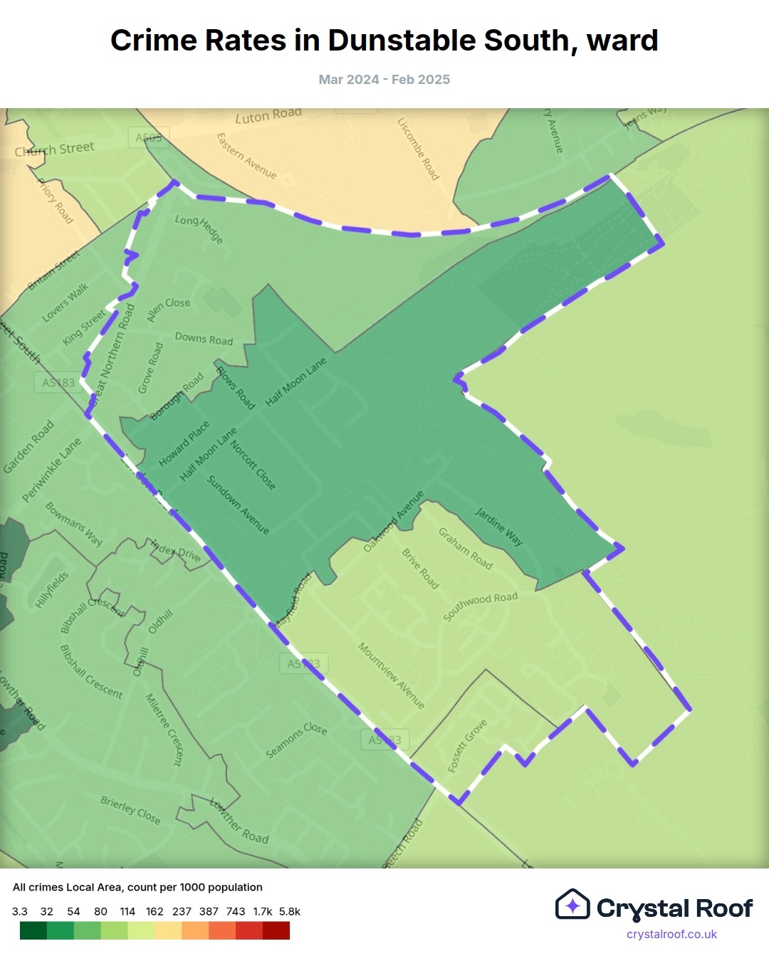 Dunstable South, (ward) includes areas with the following crime ratings (see map):