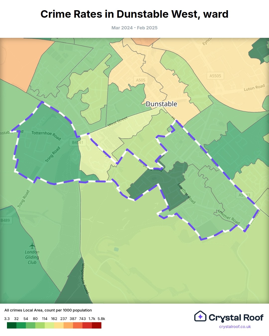Dunstable West, (ward) includes areas with the following crime ratings (see map):