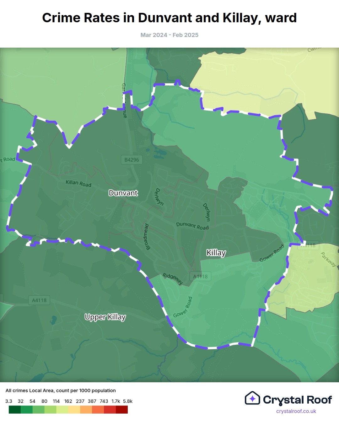 Dunvant and Killay, (ward) includes areas with the following crime ratings (see map):
