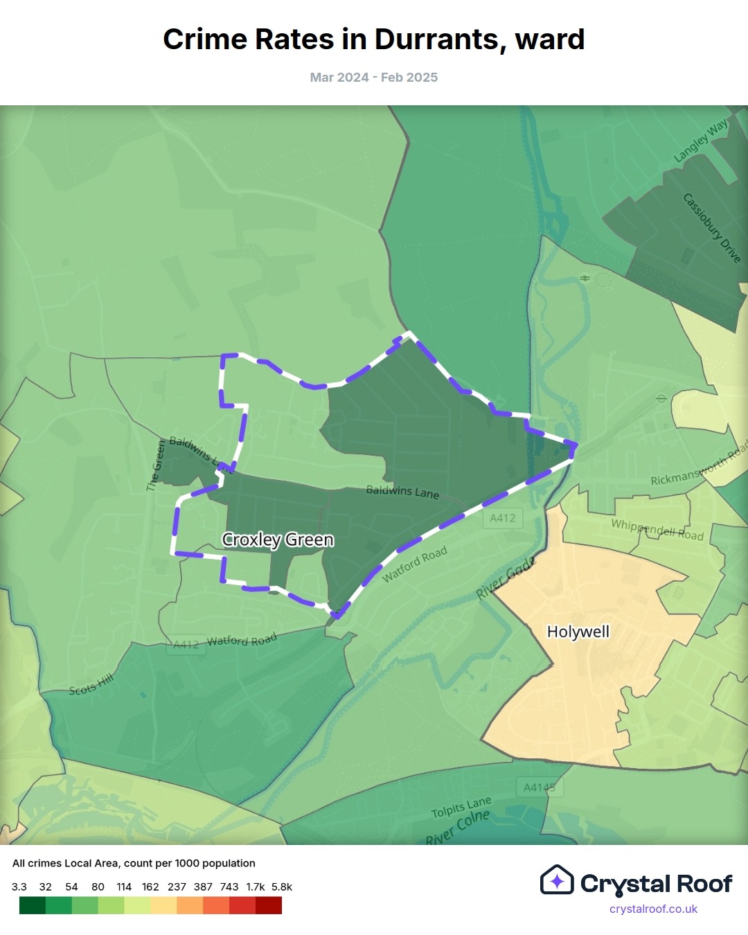 Durrants, (ward) includes areas with the following crime ratings (see map):