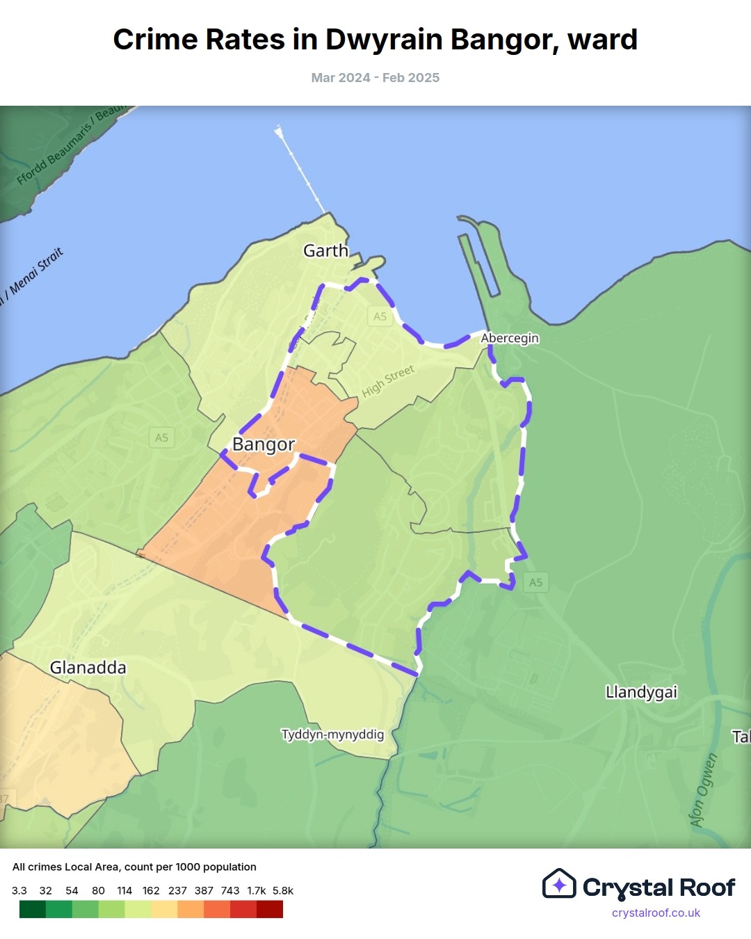 Dwyrain Bangor, (ward) includes areas with the following crime ratings (see map):
