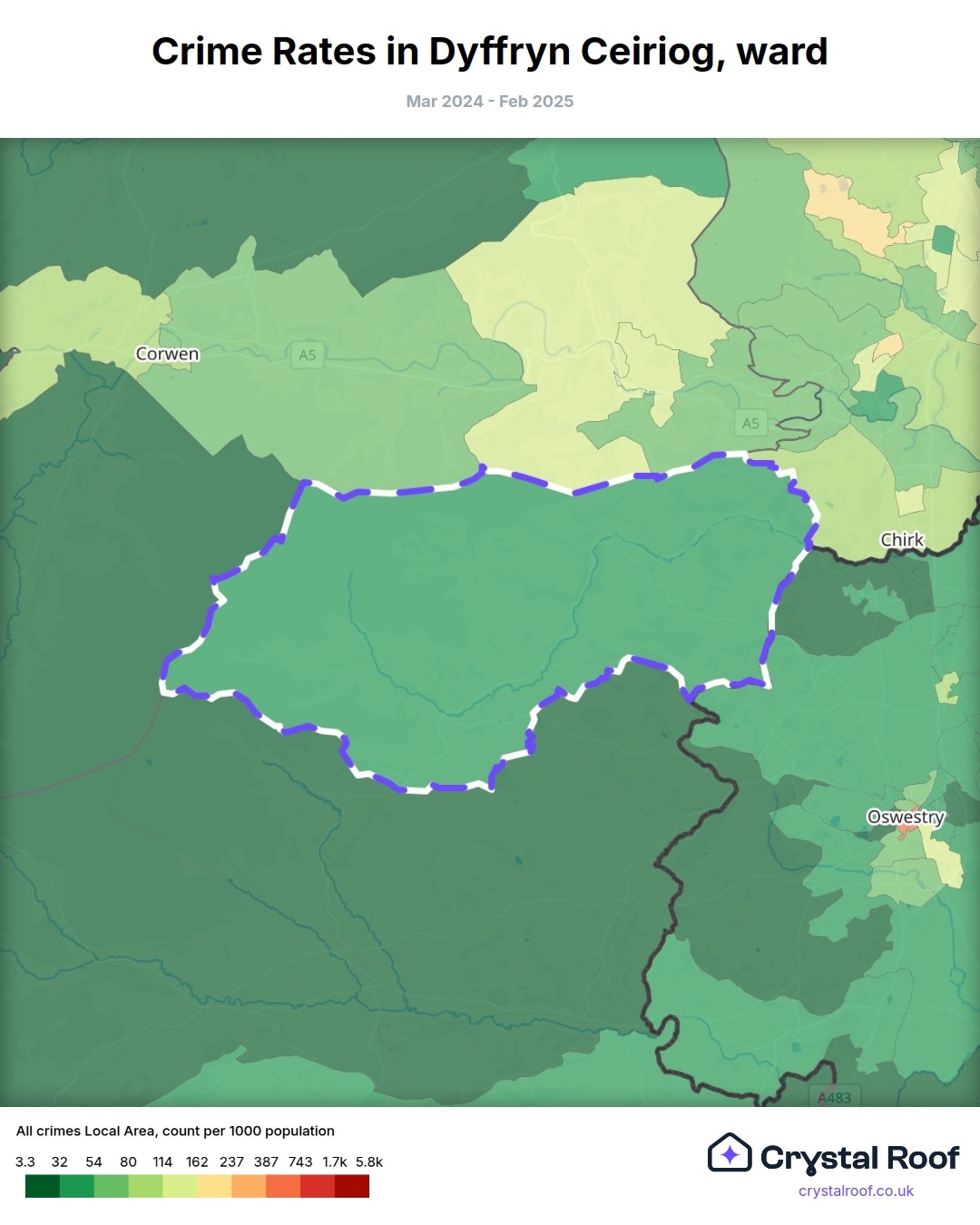 Dyffryn Ceiriog, (ward) includes areas with the following crime ratings (see map):
