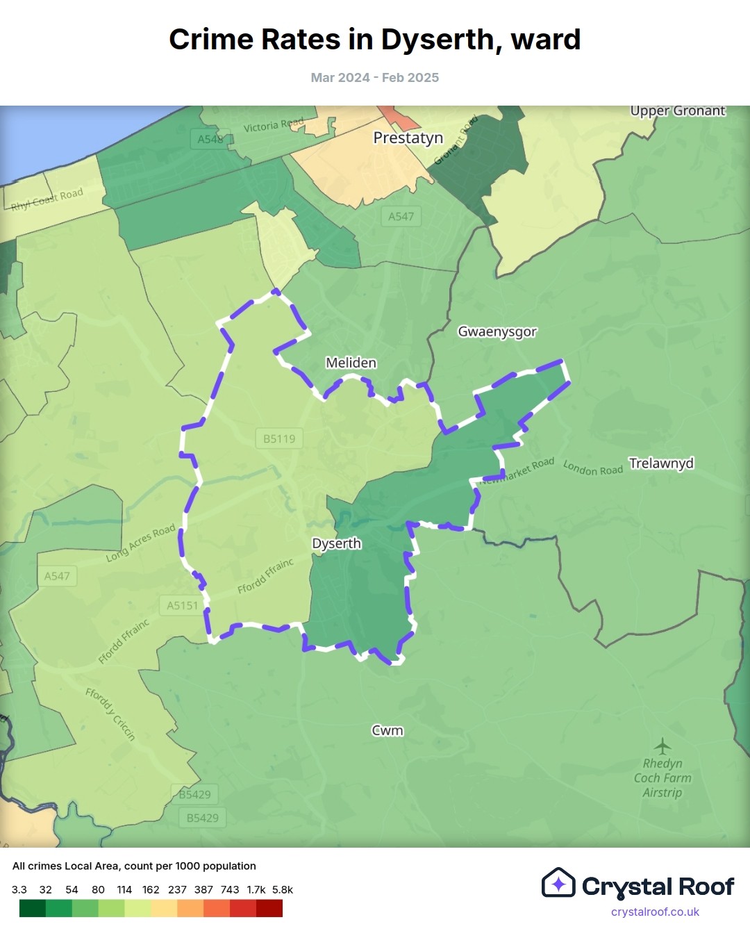 Dyserth, (ward) includes areas with the following crime ratings (see map):
