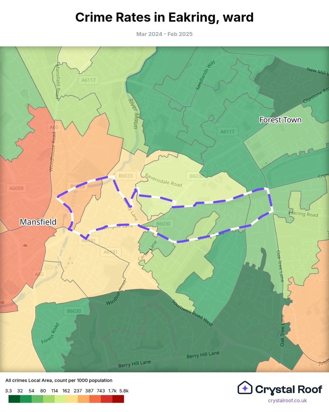 Eakring, (ward) includes areas with the following crime ratings (see map):