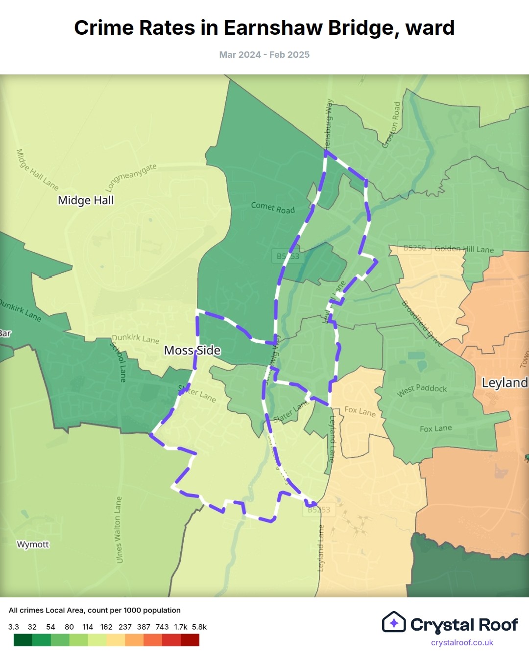 Earnshaw Bridge, (ward) includes areas with the following crime ratings (see map):