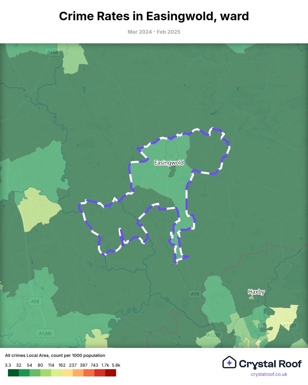 The figures in grey indicate the relative ratings of Easingwold (ward) for a specific crime type compared to other wards in England and Wales.