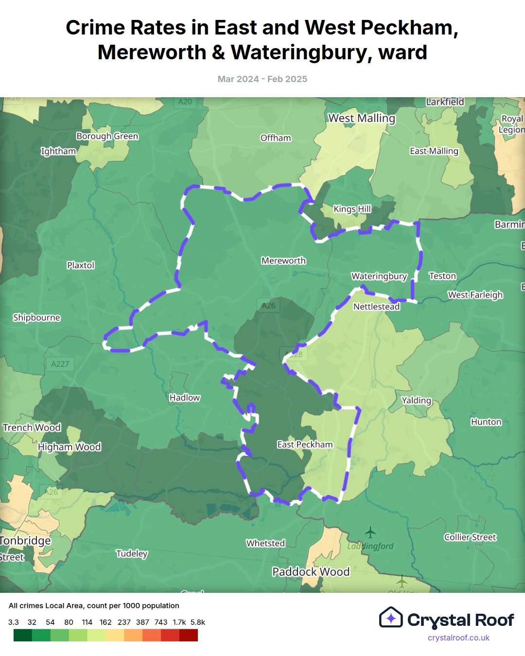 East and West Peckham, Mereworth & Wateringbury, (ward) includes areas with the following crime ratings (see map):
