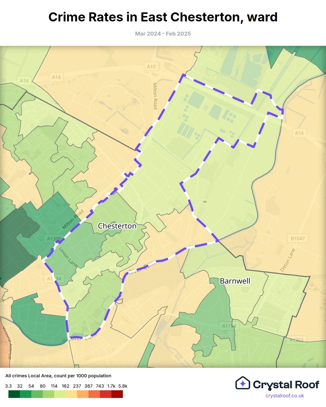 East Chesterton (ward) is located within Cambridge (borough). Annual total crime rate in Cambridge (borough) is 113 crimes per thousand resident population, which can be rated as 5 out of 10 or medium crime level compared to other local authority districts in England and Wales.