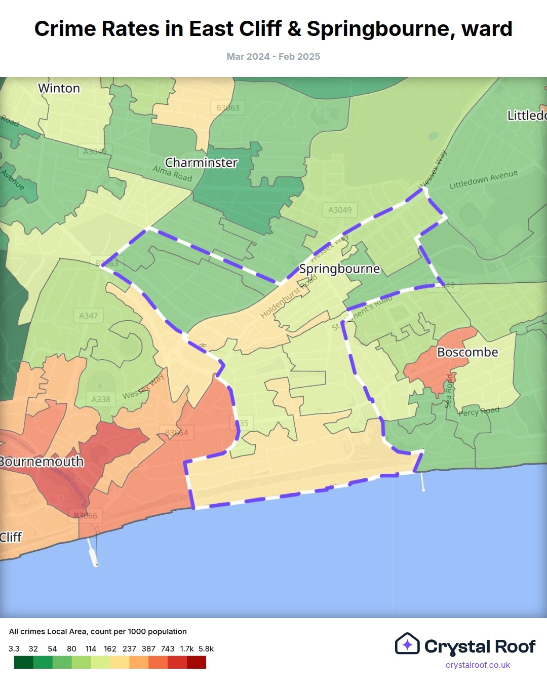 East Cliff & Springbourne, (ward) includes areas with the following crime ratings (see map):