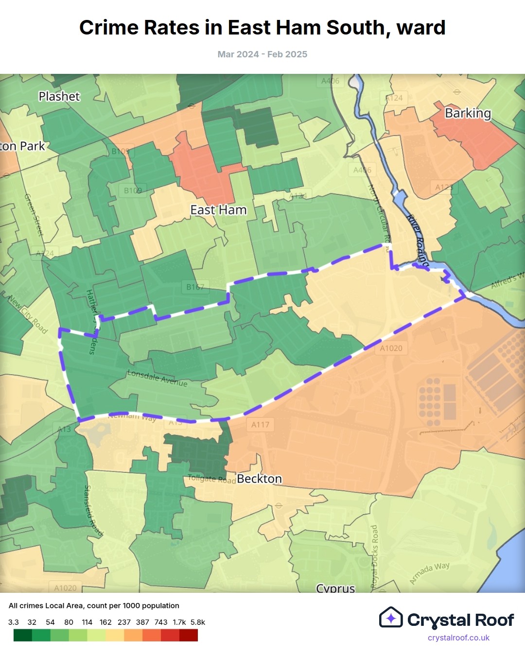 East Ham South, (ward) includes areas with the following crime ratings (see map):