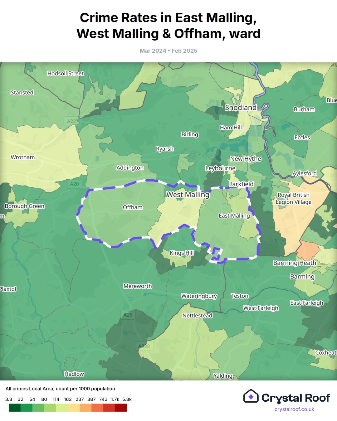 East Malling, West Malling & Offham, (ward) includes areas with the following crime ratings (see map):