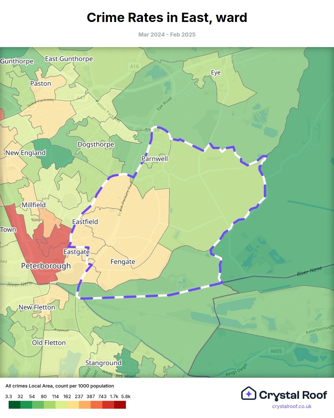 East (ward) is located within Peterborough (borough). Annual total crime rate in Peterborough (borough) is 129 crimes per thousand resident population, which can be rated as 6 out of 10 or medium crime level compared to other local authority districts in England and Wales.