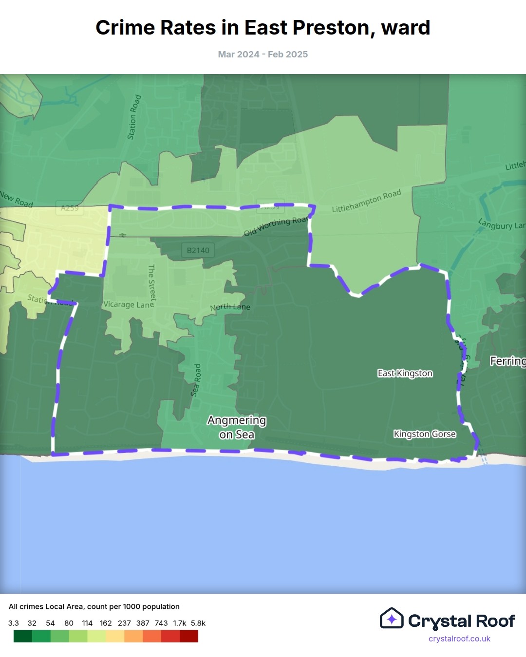 East Preston, (ward) includes areas with the following crime ratings (see map):