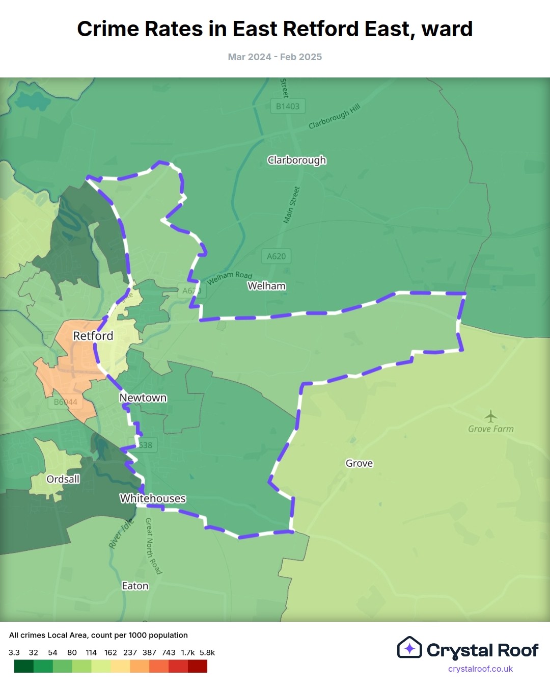 East Retford East, (ward) includes areas with the following crime ratings (see map):