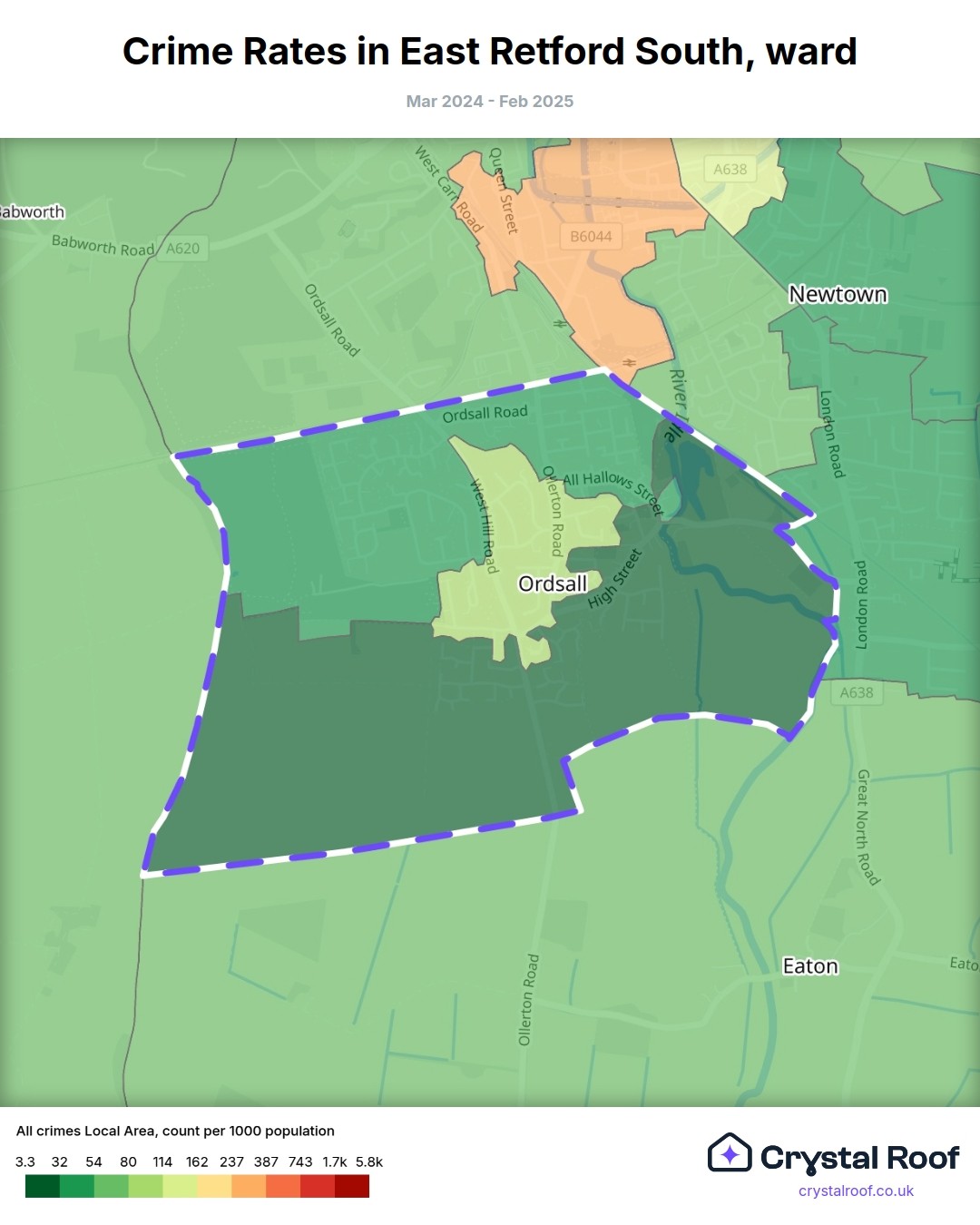 East Retford South, (ward) includes areas with the following crime ratings (see map):