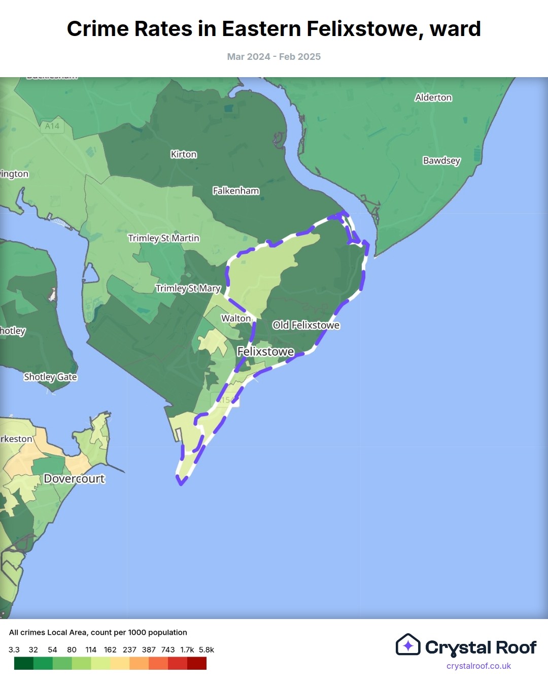 Eastern Felixstowe, (ward) includes areas with the following crime ratings (see map):