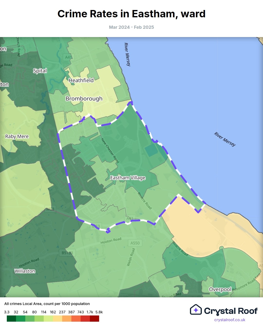 Eastham, (ward) includes areas with the following crime ratings (see map):