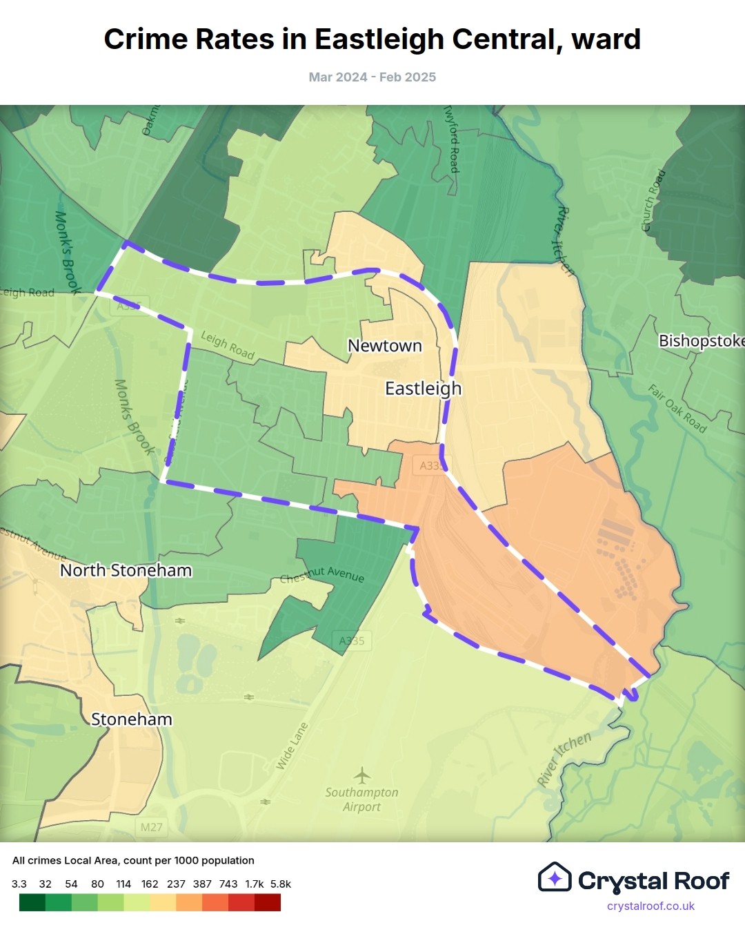 Eastleigh Central, (ward) includes areas with the following crime ratings (see map):