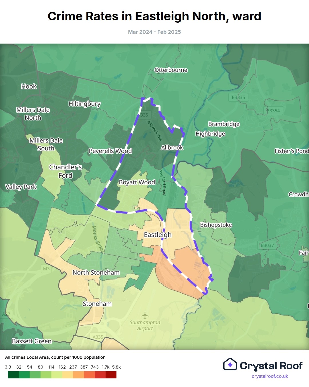 Eastleigh North, (ward) includes areas with the following crime ratings (see map):