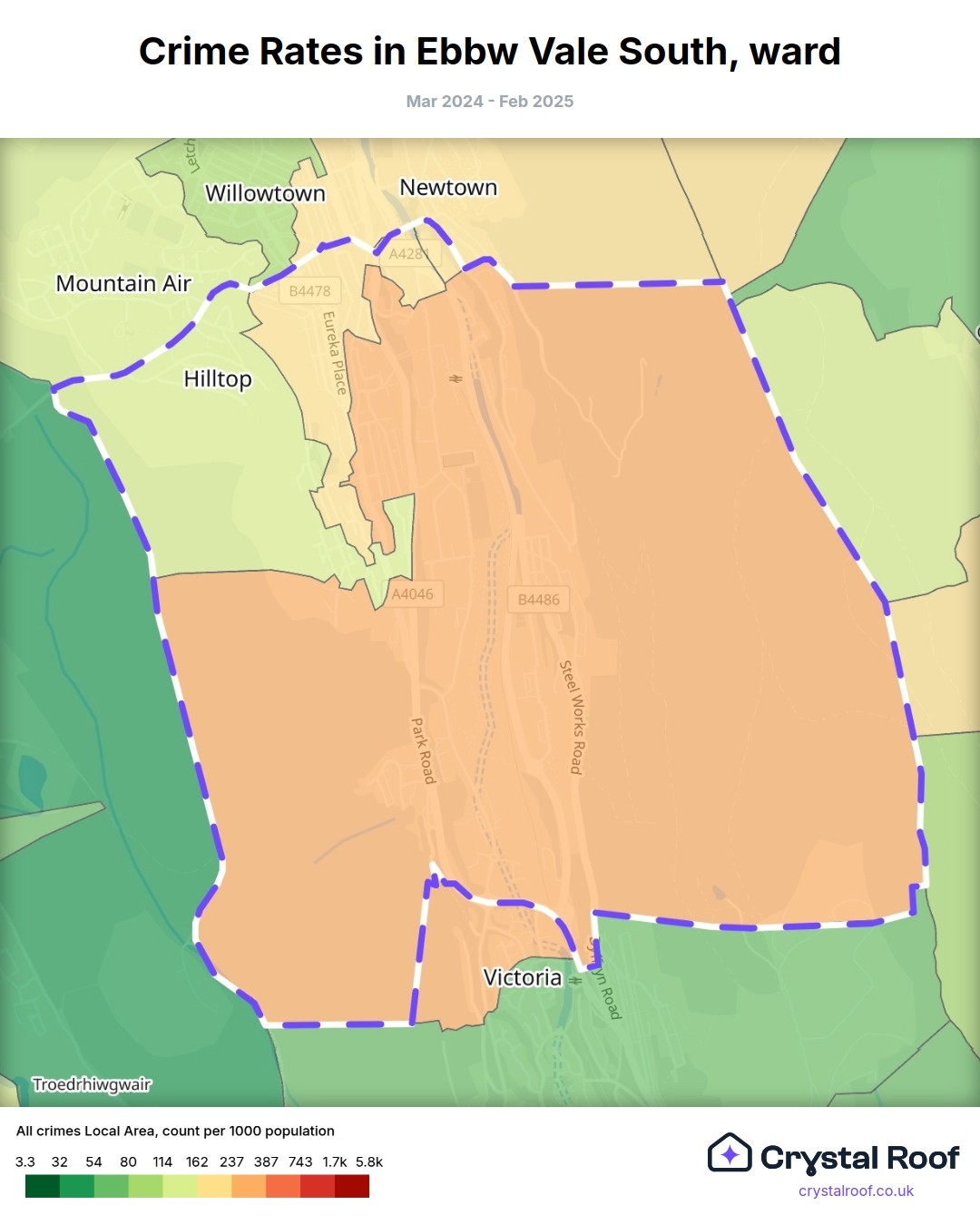 Ebbw Vale South (ward) is located within Blaenau Gwent (borough). Annual total crime rate in Blaenau Gwent (borough) is 124 crimes per thousand resident population, which can be rated as 6 out of 10 or medium crime level compared to other local authority districts in England and Wales.